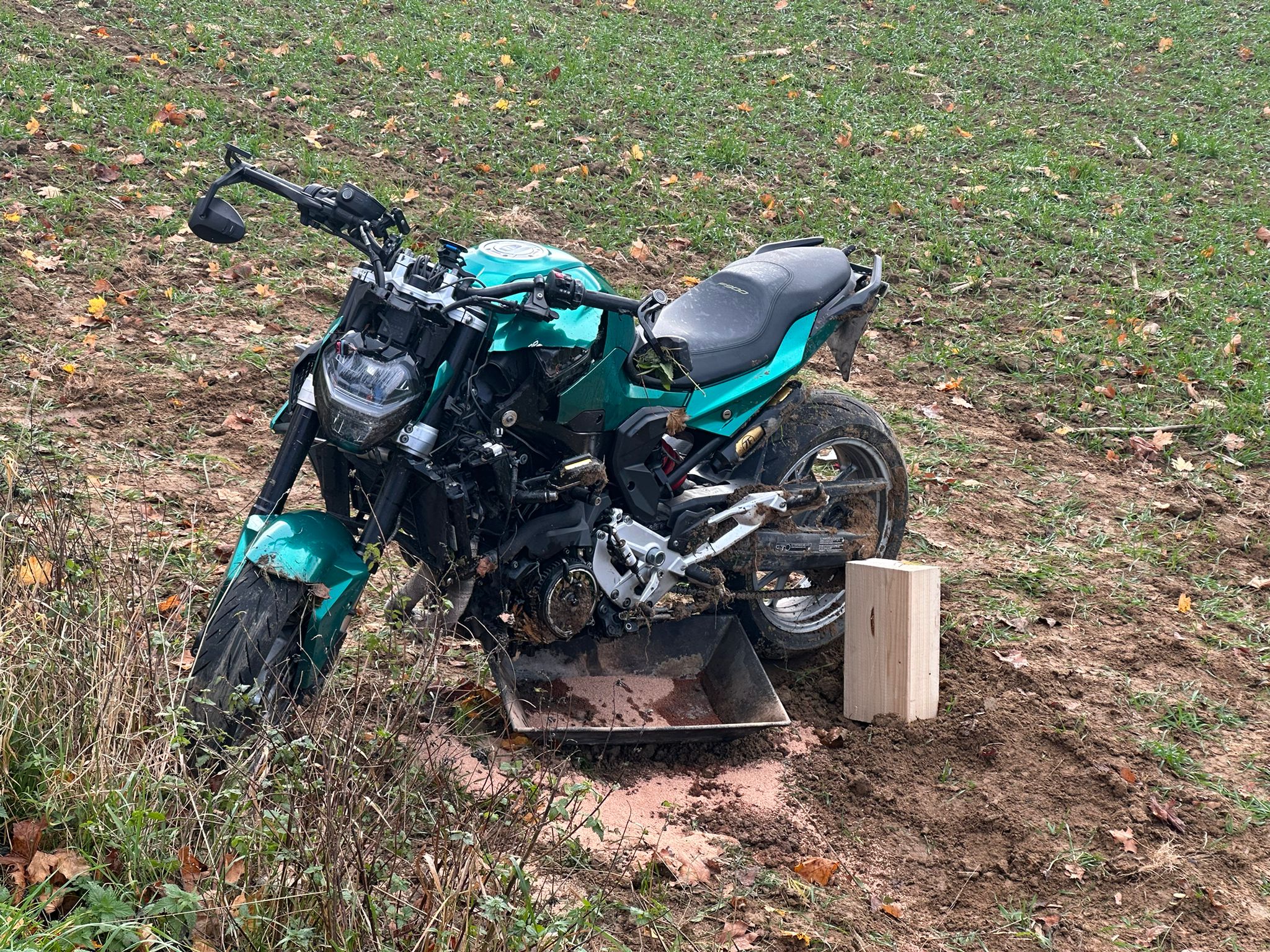 Ein Motorradfahrer ist mit seiner Maschine von der Straße abgekommen und hat dabei einen Baum gestriffen. Der Fahrer wurde vom Rettungsdienst versorgt. Wir leisteten Tragehilfe und nahmen die auslaufenden Betriebsstoffe auf.